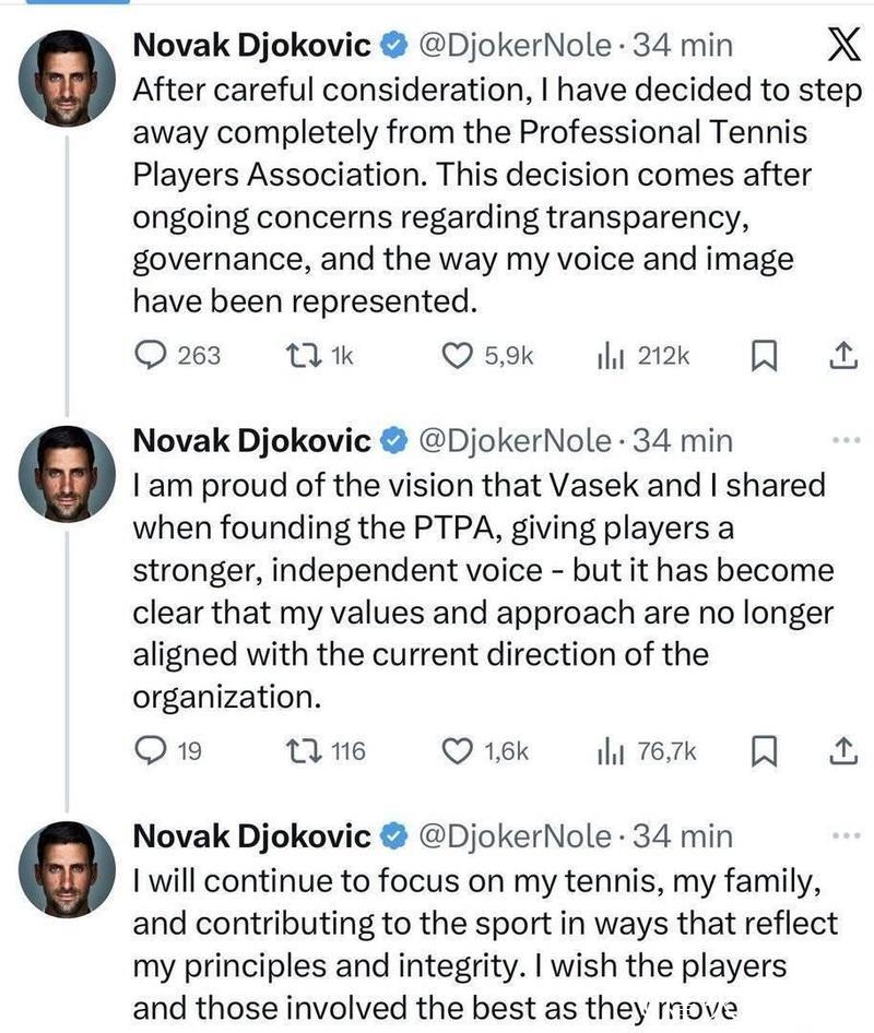 德约科维奇宣布离开职业网球运动员协会